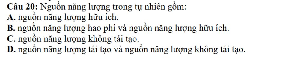Giải thích các bước giải: Trong tự nhiên có 2 dạng năng lượng là năng lượng tái tạo và năng lượng không tái tạo