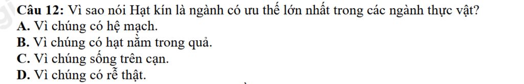 Giải thích: Hạt kín là ngành có ưu thế nhất trong các ngành thực vật bởi hạt của ngành Hạt kín được bao bọc, bảo vệ trong quả