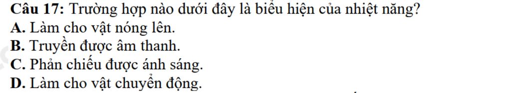 Giải thích: Biểu hiện của nhiệt năng sẽ khiến vật có nhiệt năng nóng lên, tỏa nhiệt năng ra không khí