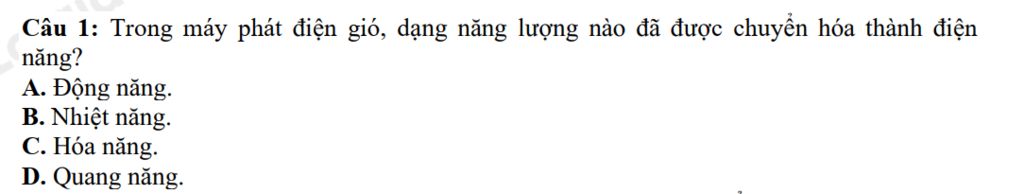 Câu 1: Trong máy phát điện gió, dạng năng lượng nào đã được chuyển hóa thành điện năng?