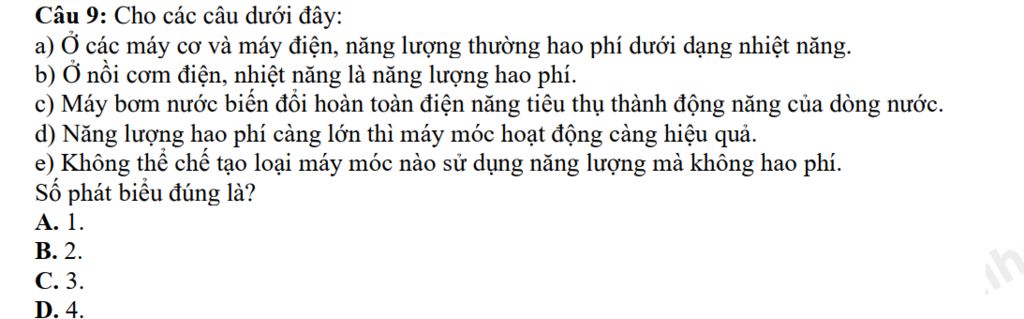 `-` Giải thích `:` Vì các máy cơ và máy điện, năng lượng thường hao phí dưới dạng nhiệt năng và không thể chế tạo loại máy móc nào sử dụng năng lượng mà không hao phí. Phát biểu đúng là `a)` và `e)`