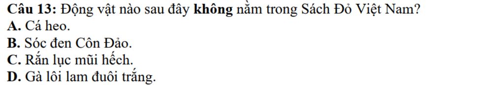 Câu `13:` Động vật nào sau đây không nằm trong Sách Đỏ Việt Nam?