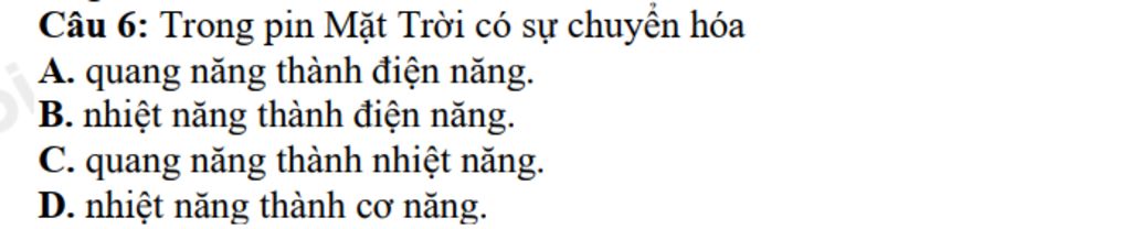 Câu 6: Trong pin Mặt Trời có sự chuyển hóa