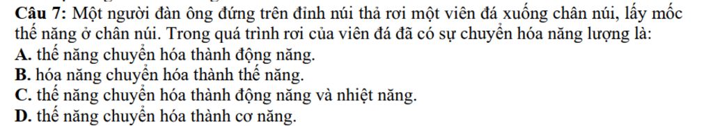 Câu 7: Một người đàn ông đứng trên đỉnh núi thả rơi một viên đá xuống chân núi, lấy mốc thế nặng ở chân núi. Trong quá trình rơi của viên đá đã có sự chuyển hóa năng lượng là: