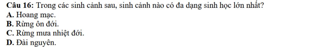 Trong các sinh cảnh đã cho, sinh cảnh rừng mưa nhiệt đới có đa dạng sinh học lớn nhất do đó là nơi có điều kiện khí hậu, môi trường sống thuận lợi nhất cho đa số các loài sinh vật sống.