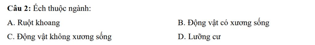`->``bbD`$\\$Ếch là loài động vật có xương sống và thuộc lớp Lưỡng cư