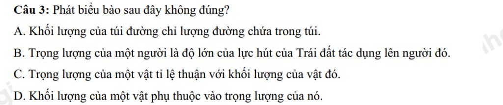 D. Khối lượng của một vật phụ thuộc vào trọng lượng của nó.