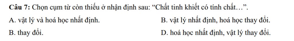 Câu `7:` Chọn cụm từ còn thiếu ở nhận định sau: “Chất tinh khiết có tính chất...”.