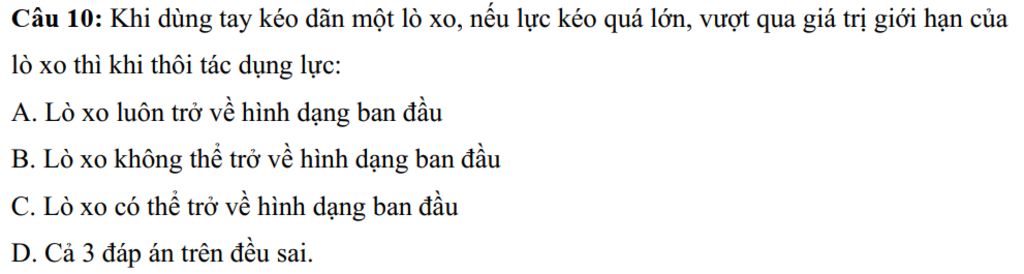 Câu `10:` Khi dùng tay kéo dãn một lò xo, nếu lực kéo quá lớn, vượt qua giá trị giới hạn của lò xo thì khi thôi tác dụng lực `:`