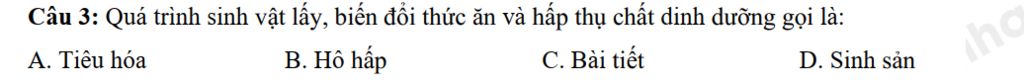 `@` Quá trình sinh vật lấy, biến đổi thức ăn và hấp thụ chất dinh dưỡng gọi là tiêu hóa