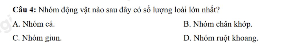`->``bbB`$\\$Nhóm chân khớp là nhóm có số lượng loài lớn nhất trong số các ngành động vật. Chúng chiếm `80%` tất cả sinh vật trên Trái Đất