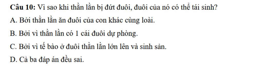 →Chọn C.Bởi vì tế bào ở đuôi thằn lằn lớn lên và sinh sản.