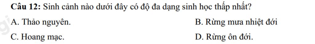 `@`Hoang mạc có độ đa dạng sinh học thấp vì hoang mạc là nơi có độ ẩm thấp và khắc nghiệt