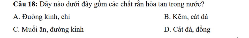 Câu `18:` Dãy nào dưới đây gồm các chất rắn hòa tan trong nước?