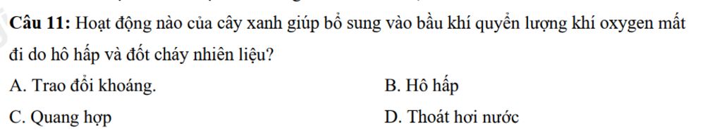 Hoạt động của cây xanh giúp bổ sung và bầu khí quyển lượng khí oxygen mất đi do hô hấp và đốt cháy nhiên liệu: