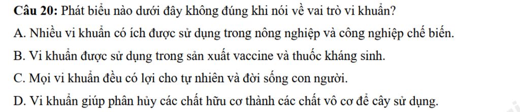 Câu 20: Phát biểu nào dưới đây không đúng khi nói về vai trò vi khuẩn?