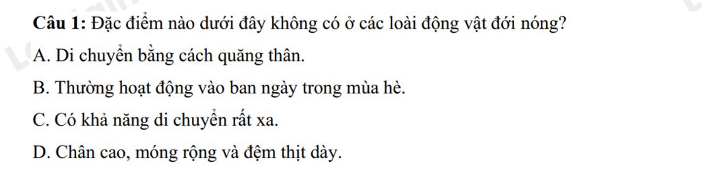 `->``bbB`$\\$Động vật đới nóng thường:$\\$ `-`Di chuyển bằng cách quăng thân$\\$ `-`Có khả năng di chuyển rất xa$\\$ `-`Chân cao, móng rộng và đệm thịt dày