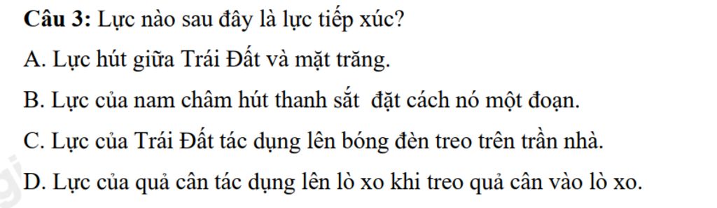 `-` Trong các đáp án, lực tiếp xúc là lực của quả cân tác dụng lên lò xo khi treo quả cân vào lò xo.
