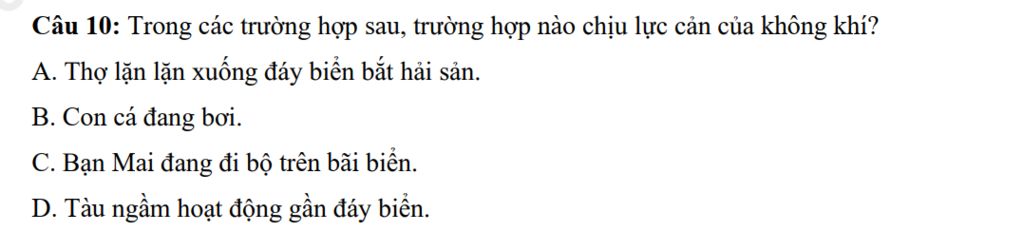 Câu 10: Trong các trường hợp sau, trường hợp nào chịu lực cản của không khí?