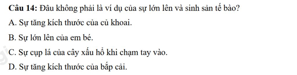 Không phải là ví dụ của sự lớn lên và sinh sản tế bào: Sự cụp lá của cây xấu hổ khi chạm tay vào.