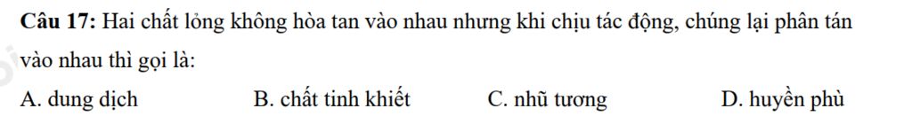 Hai chất lỏng không hòa tan vào nhau nhưng khi chịu tác động, chúng lại phân tán vào nhau thì gọi là: Nhũ tương