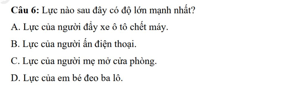 Câu `6:` Lực nào sau đây có độ lớn mạnh nhất?