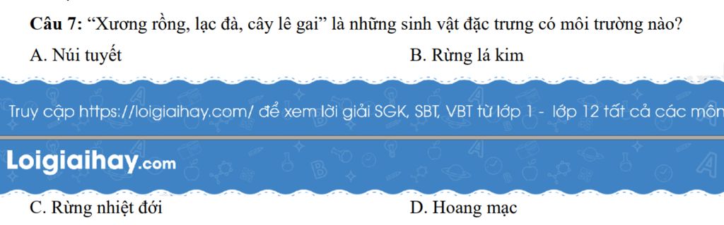 Câu 7: “Xương rồng, lạc đà, cây lê gai” là những sinh vật đặc trưng có môi trường nào?