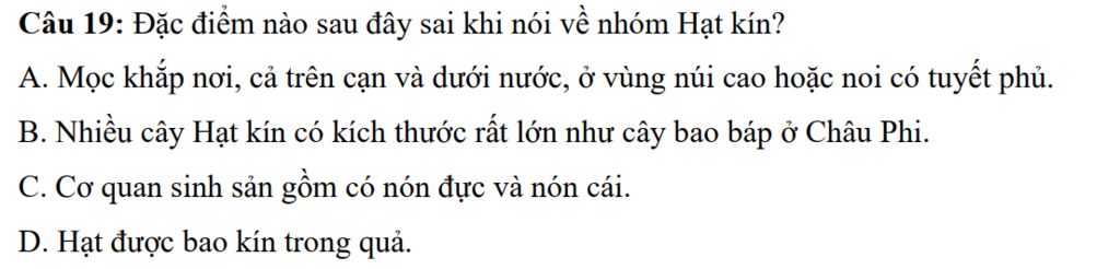 Đặc điểm "Cơ quan sinh sản gồm có nón đực và nón cái." sai khi nói về nhóm Hạt kín