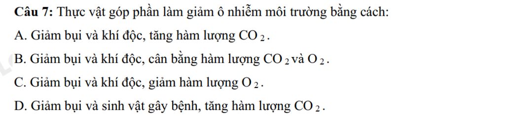 Câu `7:` Thực vật góp phần làm giảm ô nhiễm môi trường bằng cách `:`