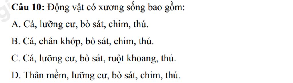 Câu `10:` Động vật có xương sống bao gồm `:`