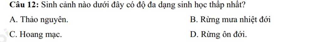 Câu 12: Sinh cảnh nào dưới đây có độ đa dạng sinh học thấp nhất?
