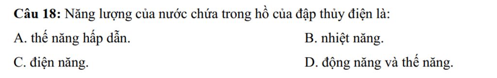 `-` Năng lượng của nước chứa trong hồ của đập thủy điện là thế năng hấp dẫn.