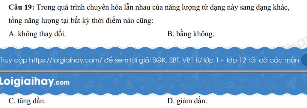 Giải thích: Khi chuyển hóa năng lượng, tổng năng lượng lúc nào cũng không thay đổi