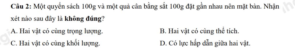 `-` Một quyển sách 100g và một quả cân bằng sắt 100g `=>` A, B đúng