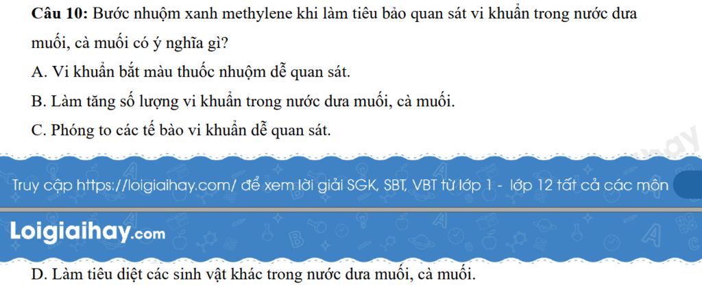 Câu 10: Bước nhuộm xanh methylene khi làm tiêu bảo quan sát vi khuẩn trong nước dưa muối, cà muối có ý nghĩa gì?