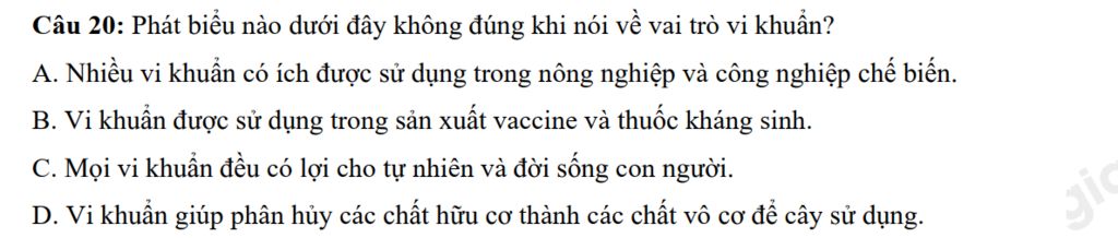 Câu 20: Phát biểu nào dưới đây không đúng khi nói về vai trò vi khuẩn?