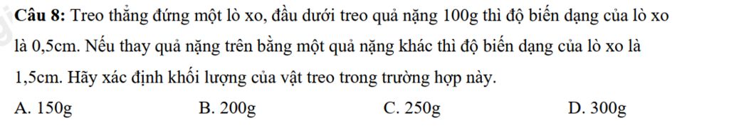 Câu `8:` Treo thẳng đứng một lò xo, đầu dưới treo quả nặng `100g` thì độ biến dạng của lò xo là `0,5cm`. Nếu thay quả nặng trên bằng một quả nặng khác thì độ biến dạng của lò xo là `1,5cm`. Hãy xác định khối lượng của vật treo trong trường hợp này.