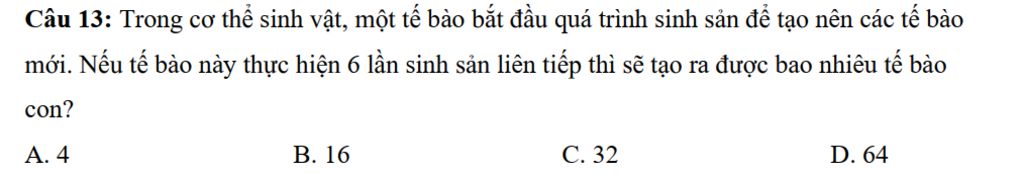 Câu `13:` Trong cơ thể sinh vật, một tế bào bắt đầu quá trình sinh sản để tạo nên các tế bào mới. Nếu tế bào này thực hiện `6` lần sinh sản liên tiếp thì sẽ tạo ra được bao nhiêu tế bào con?