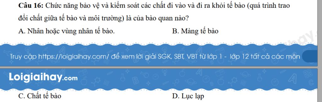 Câu `16:` Chức năng bảo vệ và kiểm soát các chất đi vào và đi ra khỏi tế bào (quá trình trao đổi chất giữa tế bào và môi trường) là của bào quan nào?