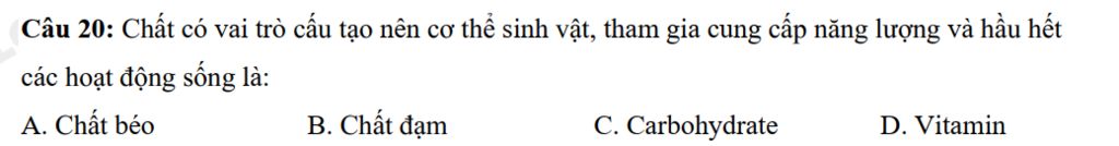 Câu `20:` Chất có vai trò cấu tạo nên cơ thể sinh vật, tham gia cung cấp năng lượng và hầu hết các