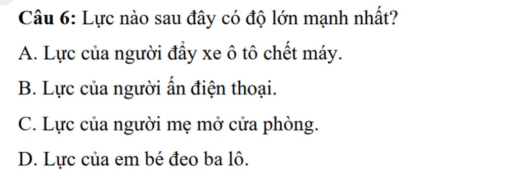 Trong các trường hợp đã cho, trường hợp lực của người đẩy xe ô tô chết máy là mạnh nhất trong vì nó là trườn hợp mà người dùng lực mất nhiều sức nhất.