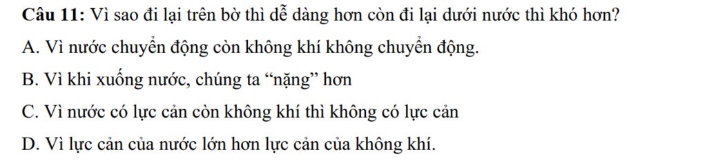 Giải thích: Khi đi trên bờ, không khí có khối lượng nhẹ hơn nên lực cản của không khí cũng nhỏ hơn nên đi được dễ dàng. Khi đi dưới nước, nước có khối lượng năng hơn nên lực cản của nước cũng lớn hơn nên di chuyển khó hơn
