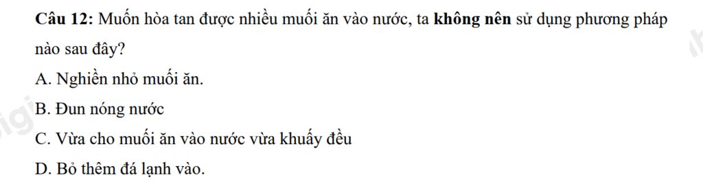 Câu `12:` Muốn hòa tan được nhiều muối ăn vào nước, ta không nên sử dụng phương pháp nào sau đây?
