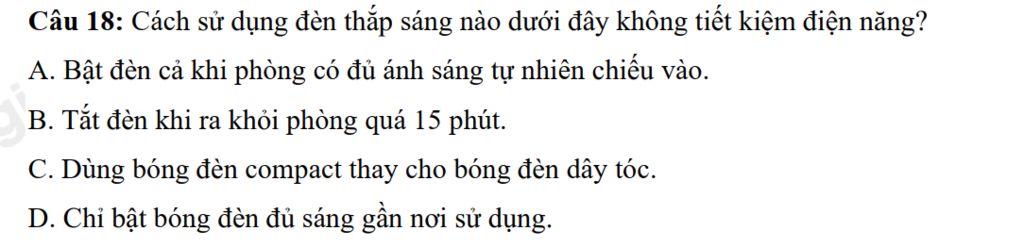 Câu 18: Cách sử dụng đèn thắp sáng nào dưới đây không tiết kiệm điện năng?