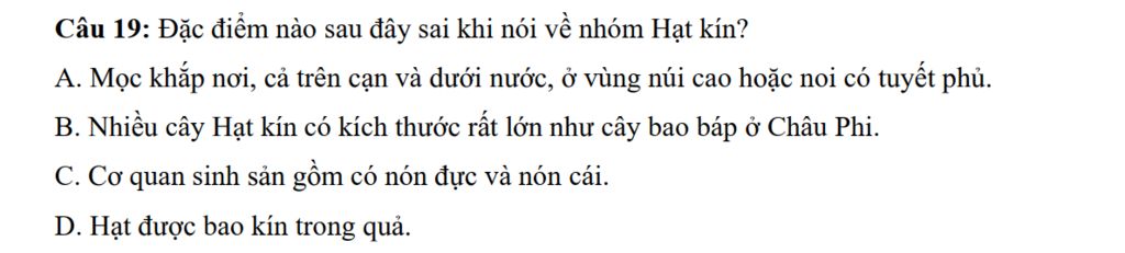 Câu `19:` Đặc điểm nào sau đây sai khi nói về nhóm Hạt kín?