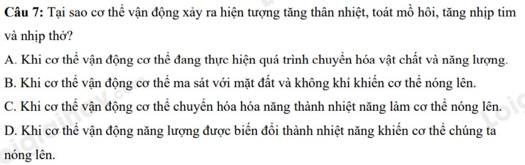 `@`Khi cơ thể vận động, cơ thể cần nhiều năng lượng hơn để thực hiện các quá trình chuyển hóa vật chất và năng lượng, quá trình chuyển thành năng lượng và quá trình chuyển hóa giúp làm tăng nhiệt độ cơ thể