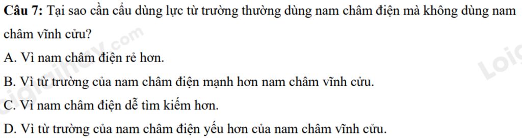 Câu `7`: Tại sao cần cẩu dùng lực từ trường thường dùng nam châm điện mà không dùng nam châm vĩnh cửu?