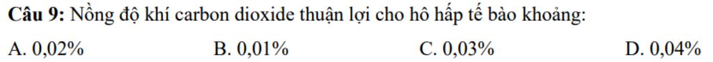 Nồng độ khí carbon dioxide thuận lợi cho hô hấp tế bào khoảng:`0,03%`