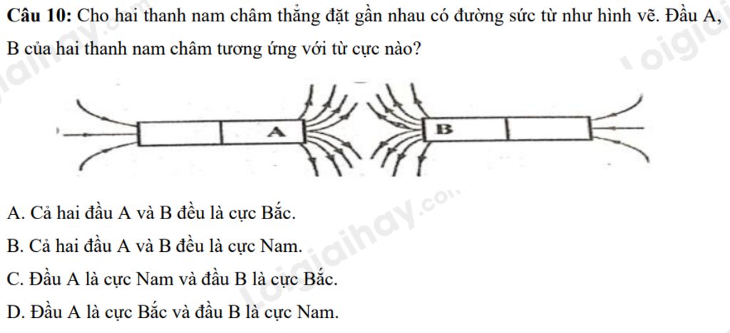 Khi hai thanh nam châm thẳng đặt gần nhau có đường sức từ như hình vẽ. Cả đầu A, B của hai thanh nam châm tương ứng với từ cực Bắc