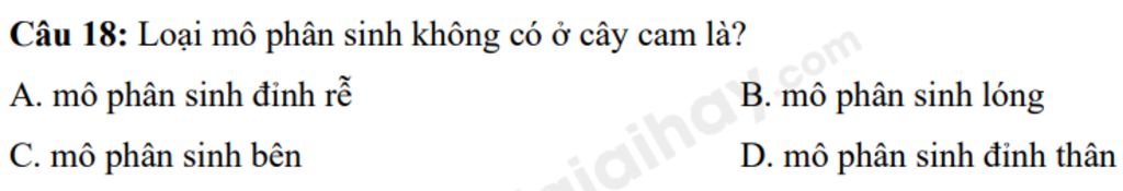 `->` Loại mô phân sinh không có ở cây cam là mô phân sinh lóng